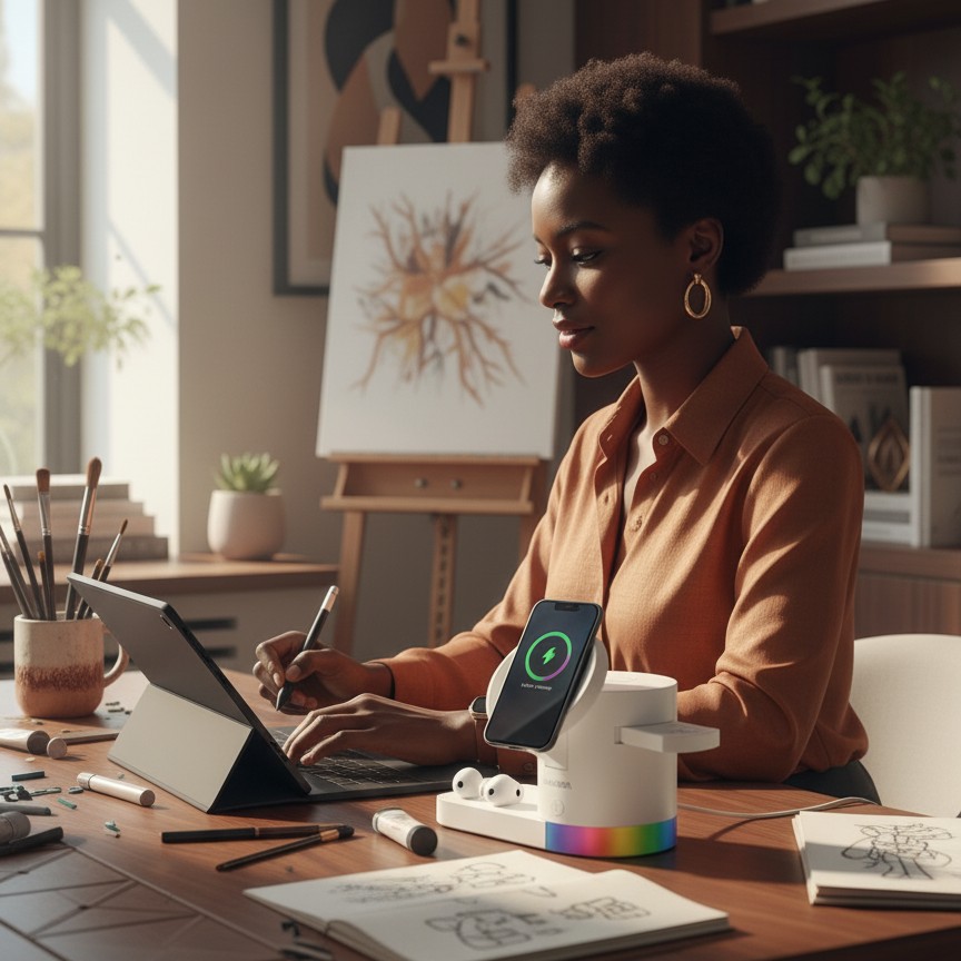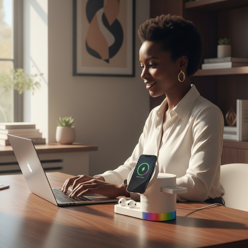 Libérez votre bureau du désordre des chargeurs multiples. Notre station centralise tous vos besoins en énergie en un seul point, vous offrant un espace net, organisé et propice à la concentration. C’est le compagnon idéal pour optimiser votre productivité et garder l’esprit serein.